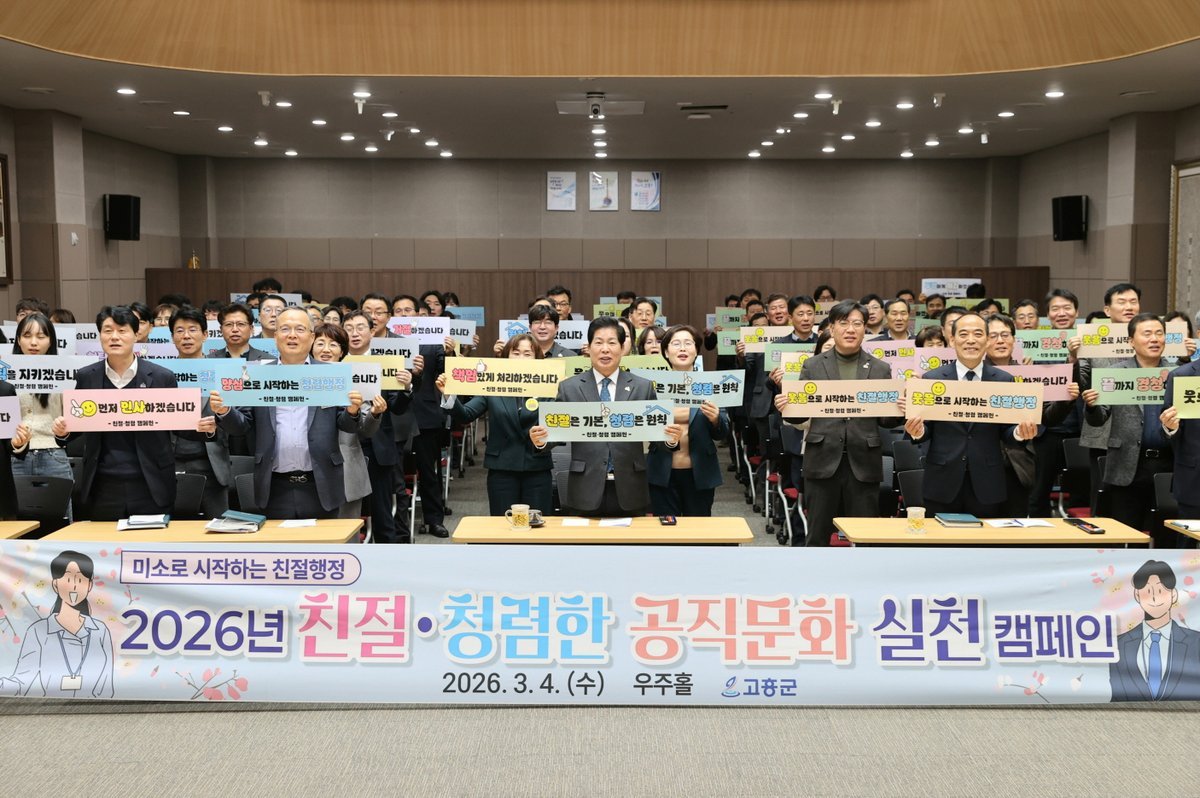 고흥군은 4일 친절하고 청렴한 공직문화 조성을 위해 전 직원을 대상으로 ‘친절 청렴 실천 캠페인’을 실시했다고 밝혔다.이번 캠페인은 ‘직원이 웃어야 군민이 웃는다’는 취지로 기획됐으며 궁극적으로 군민이 체감하는 친절 청렴 민원 서비스 품질을 높이기 위해 마련됐다.이날 행사에서는 웃음 치료 전문가를 초빙해 ‘긍정 에너지와 소통’을 주제로 웃음특강을 진행했다.업무 스트레스 해소와 감정관리 방법을 공유하며 일상 속 작은 미소가 조직 분위기를 바꾸고 민원인에 대한 친절 행정으로 이어질 수 있다는 메시지를 전달했다.이어 진행된 ‘친절 청렴 다짐 카드 퍼포먼스’에서는 직원들이 직접 작성한 다짐 문구를 함께 펼치며 군민 중심 행정 실천 의지를 다졌다.다짐 카드에는 “먼저 인사한다”, “끝까지 경청한다”, “투명하게 처리한다”등 군민을 향한 직원들의 실천 약속이 담겼다.군 종합민원실 관계자는 “친절과 청렴은 제도 이전에 직원들의 마음가짐에서 시작된다”며 “조직문화 개선을 통해 그 변화가 민원 현장에서 군민에게 전달될 수 있도록 노력하겠다”고 말했다.앞으로도 고흥군은 정기적인 친절교육과 청렴 실천 프로그램을 운영해 군민이 체감하는 행정서비스 향상에 힘쓸 계획이다.