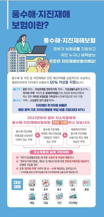 전라남도는 풍수해 지진재해보험에 가입하는 취약계층의 보험료 자부담을 줄이기 위해 도비 보조금 지원을 대폭 확대한다고 밝혔다.풍수해 지진재해보험은 2008년부터 시행한 국가정책 보험이다.태풍, 홍수, 호우, 강풍, 풍랑, 해일 대설, 지진, 8개 재해를 보장한다.주택 온실 소유자와 세입자, 상가나 공장을 소유한 소상공인이라면 누구나 가입할 수 있다.지난해 전남지역 실거주 단독주택 가입 대상은 약 14만 세대며 이 가운데 6만 3천여 세대가 풍수해 지진재해보험에 가입한 것으로 나타났다.특히 가입 세대 중 5만 4천여 세대가 차상위계층, 기초생활수급자, 한부모가족 등 취약계층으로 정책보험이 재난 취약계층의 안전망 역할을 하는 것으로 분석됐다.전남도는 취약계층의 보험료 자부담을 낮추기 위해 도비 보조금을 지난해 3억원에서 올해는 4억원으로 증액했다.이는 단순한 예산 증액을 넘어 재난 취약계층의 실질적 보장 강화를 위한 선제적 조치다.이번 추가 지원으로 취약계층의 보험료 자부담 비율은 전국 최저 수준인 8~9%까지 낮아진다.차상위계층과 한부모가족의 자부담은 기존 21.6%에서 8.64%로 기초생활수급자는 12.96%에서 7.78%로 각각 줄어들 예정이다.이에 따라 도내 취약계층의 보험료 부담이 크게 줄고 재난 발생 시 실질적 피해 보상을 받을 수 있을 것으로 기대된다.