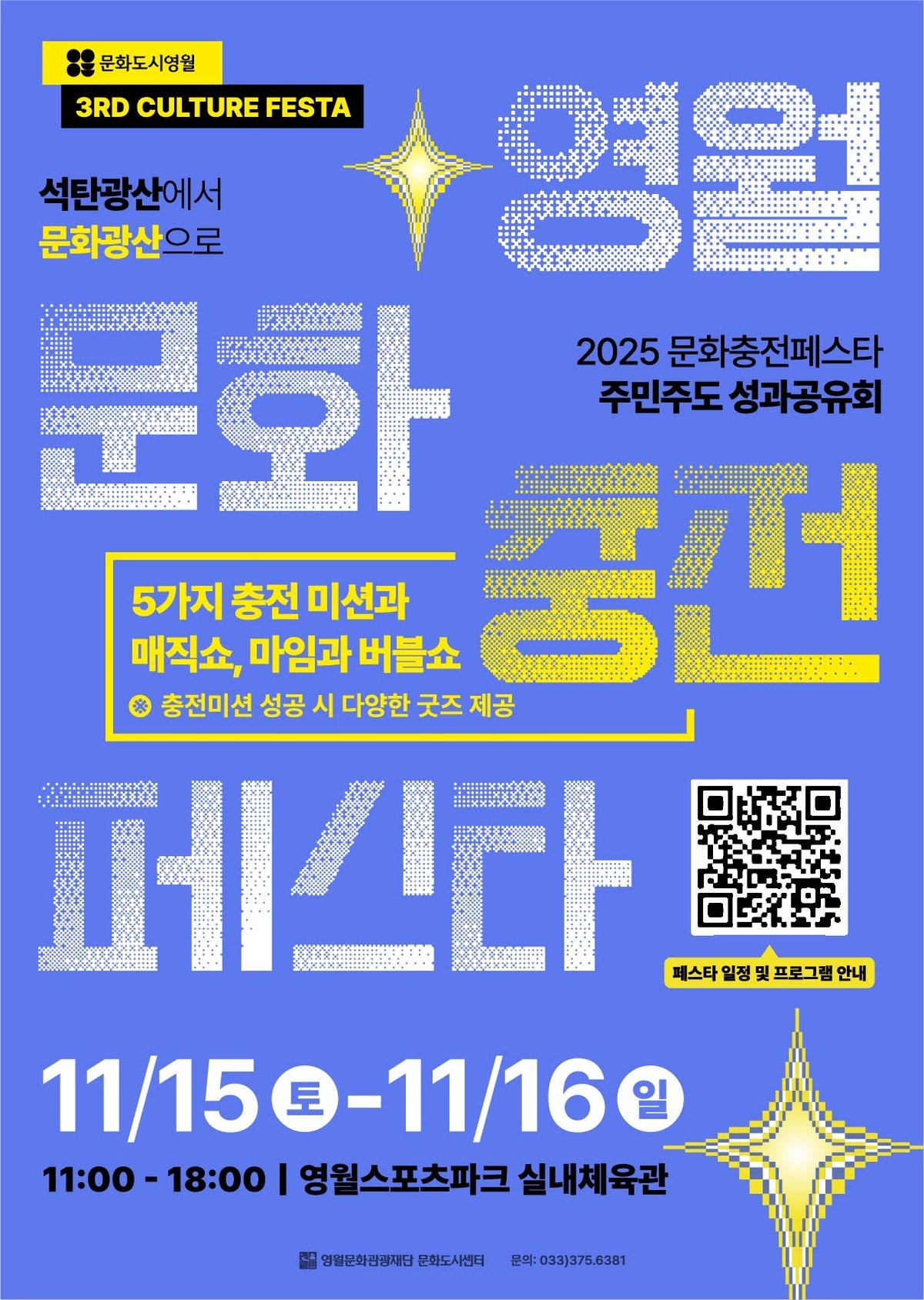 영월문화관광재단이 '2025 영월 문화충전 페스타'를 개최하며 시민들과 함께 문화도시 조성에 나선다.이번 행사는 11월 15일부터 16일까지 영월에서 열리며, 시민 참여를 통해 문화도시 조성사업의 성과를 공유하고 지역 내 문화도시 인지도를 높이는 데 목적을 둔다.'일상 속 에너지를 비우고 다시 채우는, 문화충전의 시간'이라는 주제로, 시민들이 다양한 문화 체험을 통해 재충전하고 문화도시의 의미를 자연스럽게 느낄 수 있도록 기획됐다.행사장에서는 5가지 충전 미션과 시민 포럼, 지역 예술 공연, 어린이를 위한 프로그램 등 다채로운 콘텐츠가 진행된다. 충전 미션은 투표, 영월 서체 따라 쓰기, 문화 거점 이름 맞추기 등으로 구성되어 있으며, 미션 완료 시 굿즈를 획득하고 '나만의 충전백'을 완성할 수 있다.또한, 원목 호롱, 크리스마스 양말, 라탄 바구니 만들기 등 다양한 공예 프로그램과 '페스타 사진관', 즉석 사진 콘테스트 등 체험 프로그램도 운영된다.박상헌 영월문화관광재단 대표이사는 이번 페스타를 통해 시민들이 문화적 경험을 즐기고 '문화도시 영월'의 가치를 알게 되기를 바란다고 밝혔다. 덧붙여 앞으로도 지속적인 문화도시 사업 추진을 통해 지역사회의 문화적 성장과 변화를 이끌어갈 것을 약속했다. -