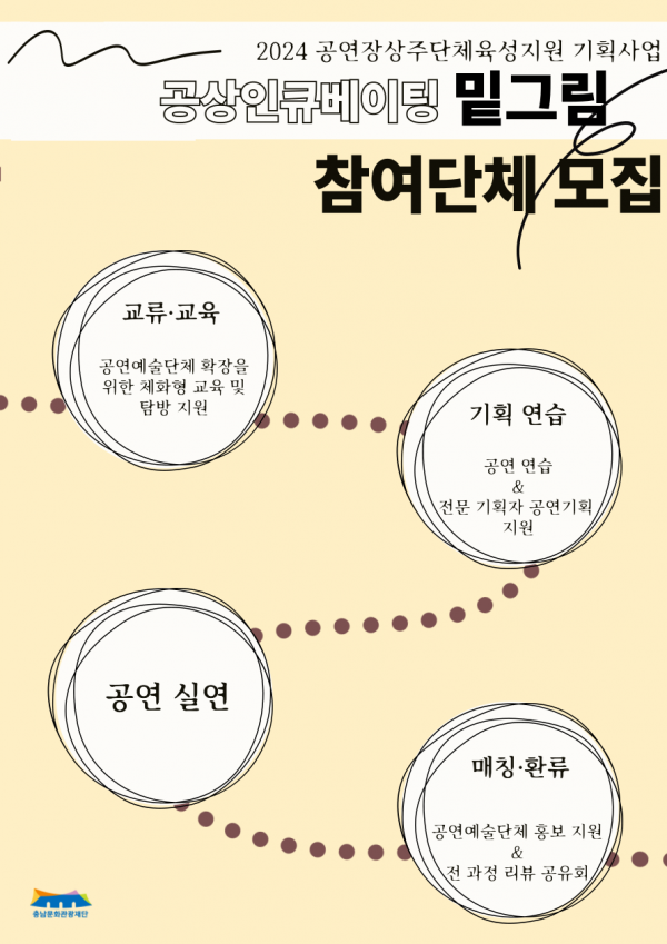 [PEDIEN] 충남문화관광재단은 도내 공연예술단체들의 기반 강화를 위한 ‘2024 공연예술단체 인큐베이팅 기획 프로그램 ‘밑그림’’ 참여단체를 오는 10월 11일까지 모집한다고 밝혔다.