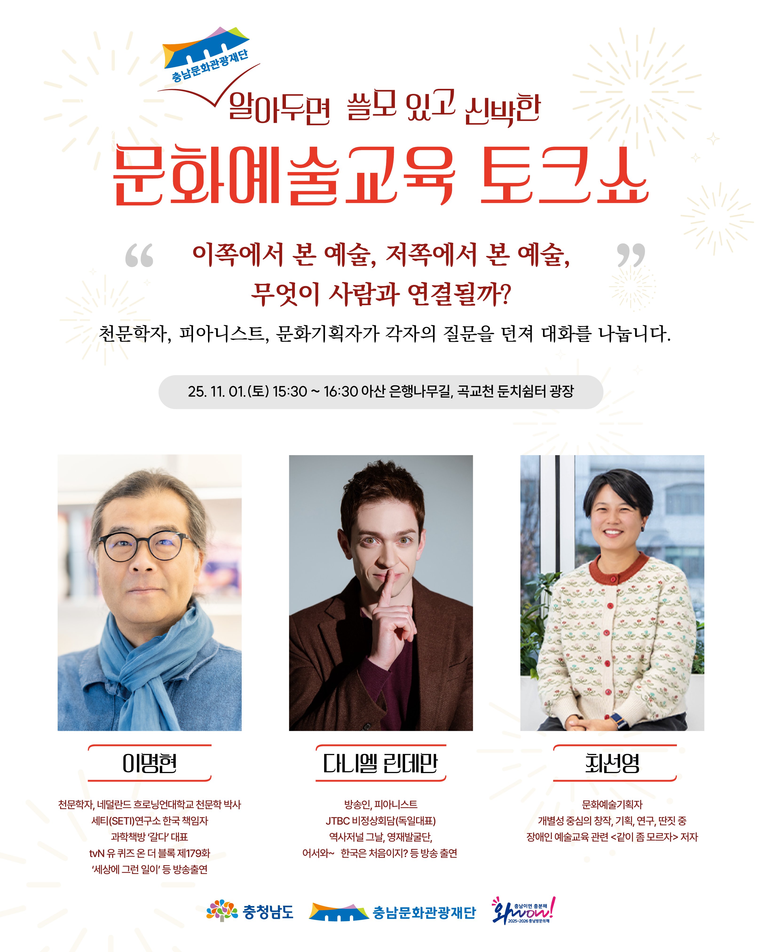 이번 토크쇼는 충남문화관광재단이 주관하는 2025 충남문화가족한마당과 연계해 진행되며 사전 예약 없이 누구나 참여 가능하다.