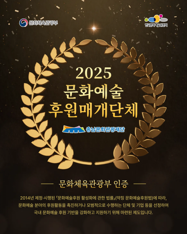 [PEDIEN] 충남문화관광재단이 문화체육관광부가 주관하고 한국문화예술위원회가 운영하는 ‘2025년도 문화예술후원매개단체 인증제도’에서 신규 인증기관으로 선정됐다.