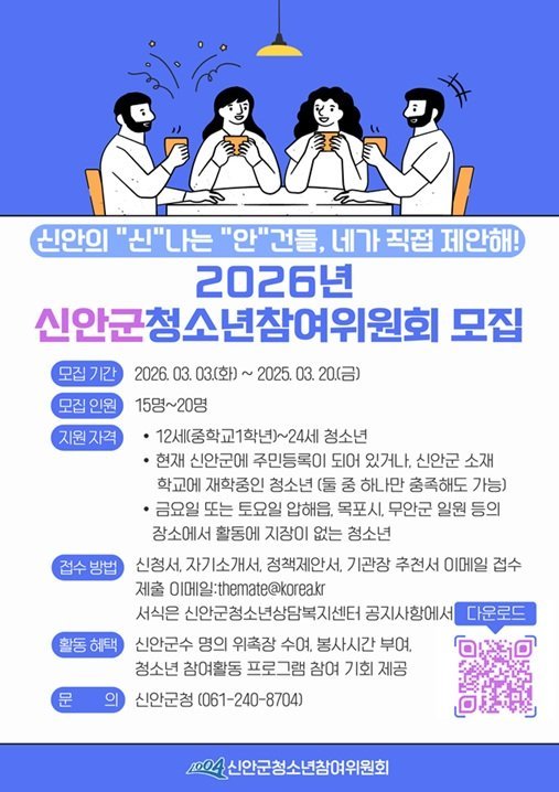 [PEDIEN] 신안군이 지역 청소년들의 생생한 목소리를 정책 현장에 직접 담아내기 위해 '2026년 신안군 청소년참여위원회'신규 위원을 모집한다.