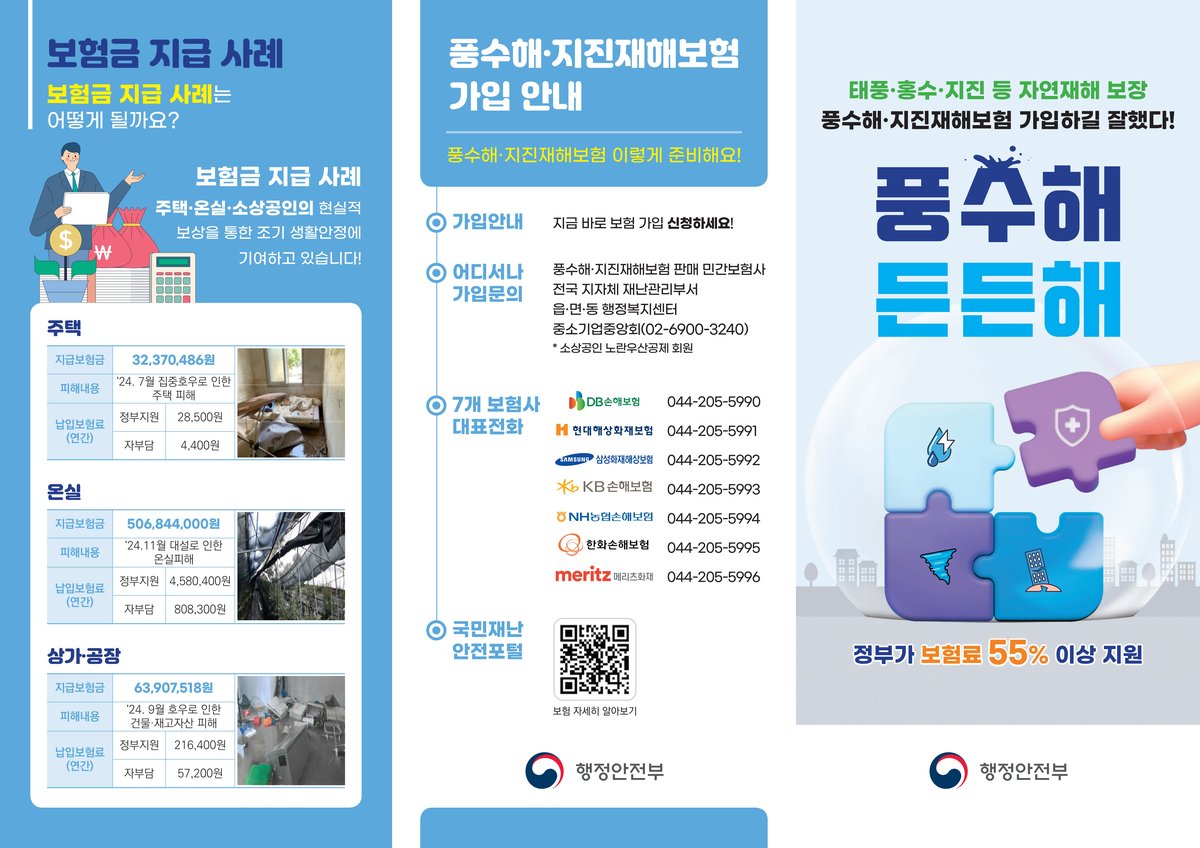 기초생활수급자와 차상위계층은 추가 지원을 통해 더 낮은 비용으로 가입할 수 있다. 옥승현 안전총괄과장은 “예측이 어려운 자연재난에 대비하기 위해서는 사전 준비가 최선의 대응”이라고 강조했다.