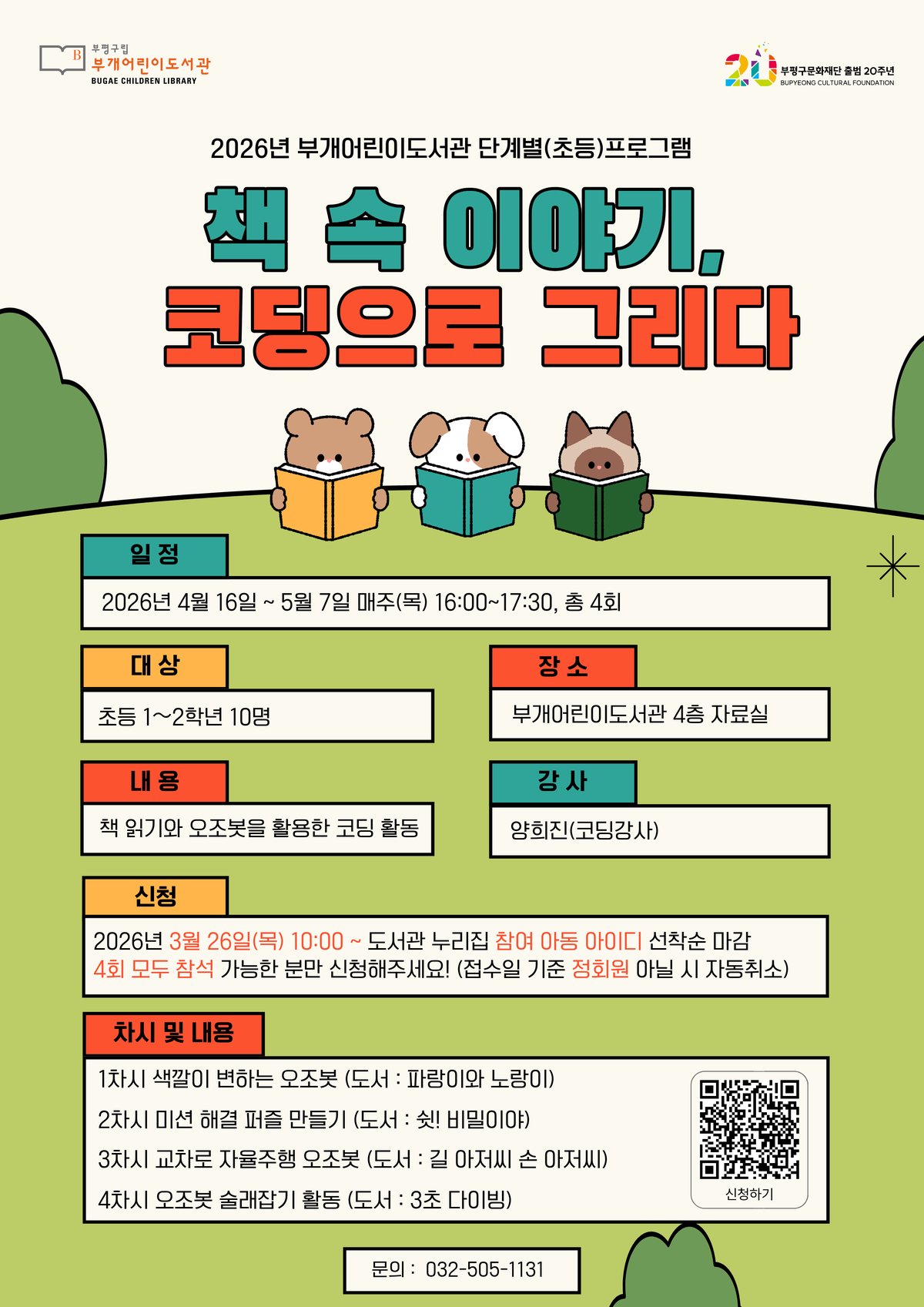 초등 저학년을 위한 특별한 프로그램이 준비되어 있다. '책 속 이야기, 코딩으로 그리다'는 4월 16일부터 5월 7일까지 매주 목요일 오후 4시에 진행된다. 총 4회에 걸쳐 그림책을 읽고, 초소형 교육용 로봇을 활용한 코딩 체험을 통해 아이들의 문제 해결 능력과 창의력을 키울 계획이다.