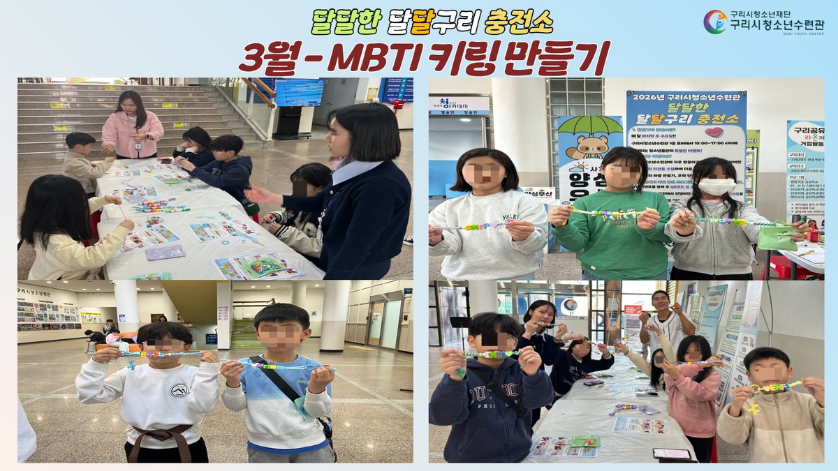 [PEDIEN] 구리시청소년재단 청소년수련관은 수련관을 방문하는 청소년들에게 즐거운 체험 기회를 제공하기 위해 3월 '달달구리 충전소'프로그램으로 '나를 표현하는 한 조각, MBTI 열쇠고리 만들기'활동을 지난 3월 25일 오후 3시부터 5시까지 수련관 1층 로비에서 진행했다.