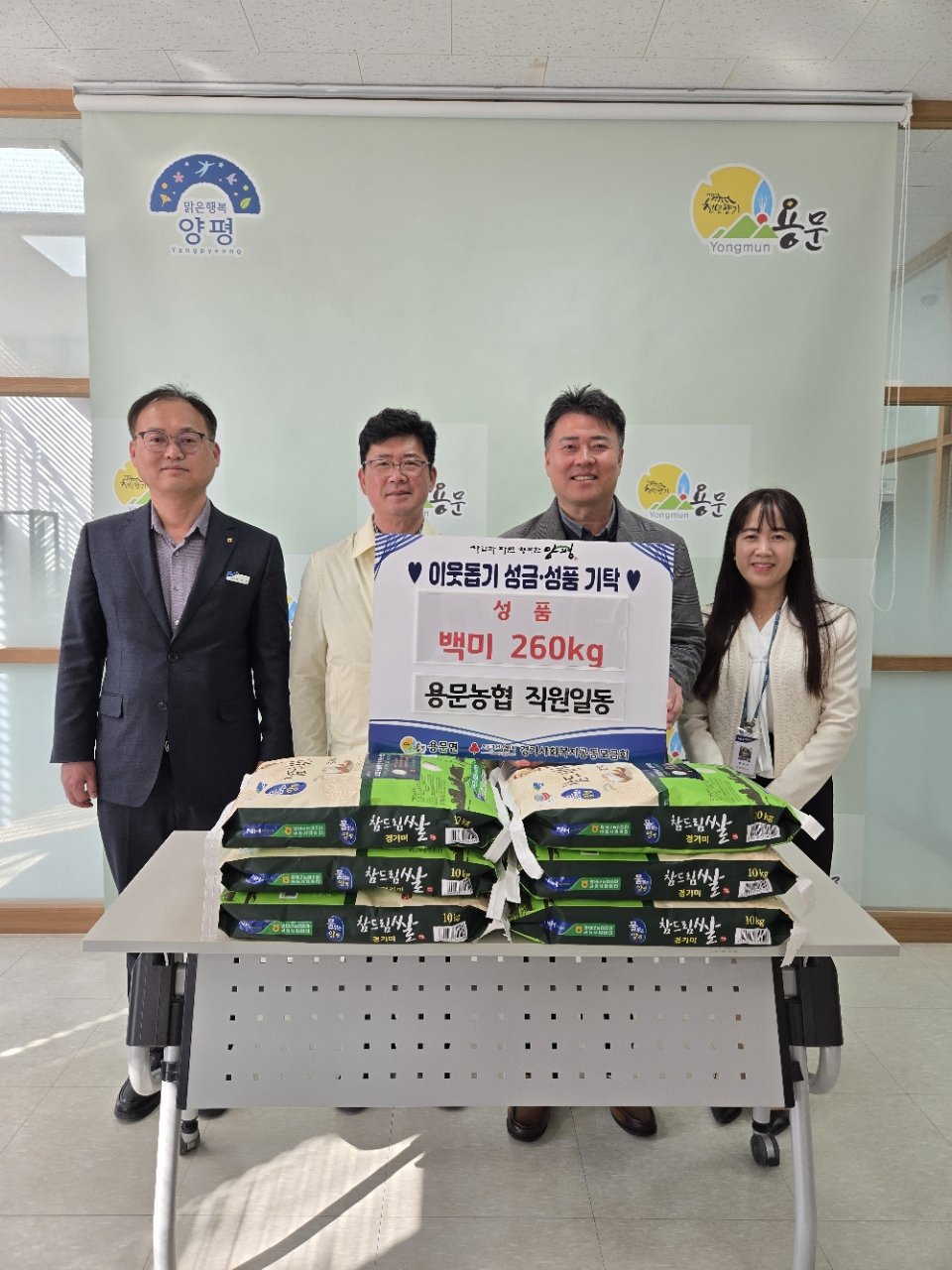 용문면은 지난 25일 용문농협 직원 일동이 10kg 쌀 26포를 기탁했다고 밝혔다. 직원들은 십시일반 급여를 모아 이웃사랑을 실천했다.