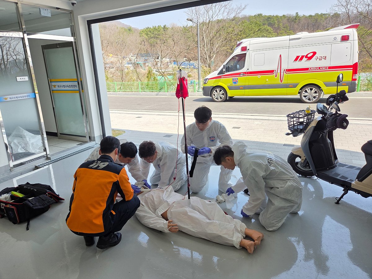특히 교육 마지막 날에는 영진전문대 응급구조학과 학과장이 평가를 진행했다. 필기와 실기 평가를 통해 심폐소생술, 자동심장충격기 사용법, 초기 대응 환자 평가 등 현장 활용 가능 기술 숙련도를 검증했다.