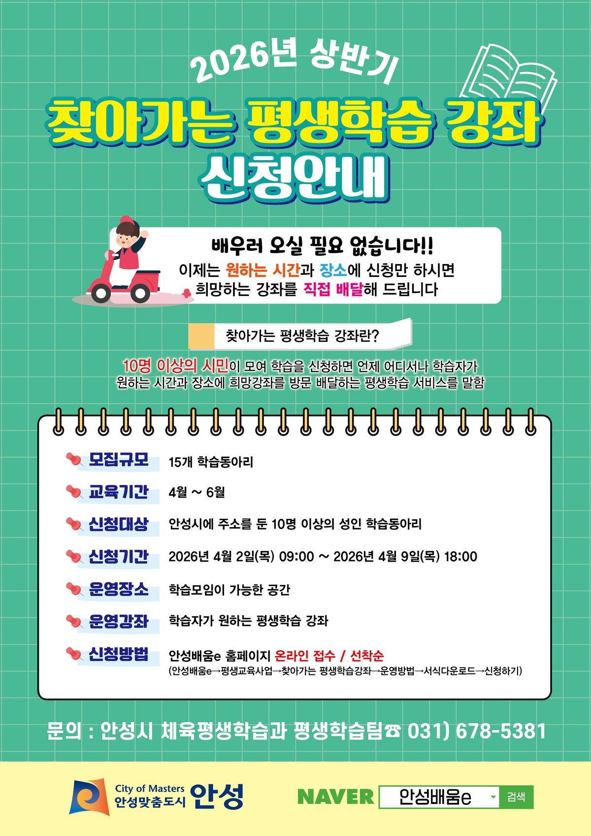 [PEDIEN] 안성시가 시민들의 평생학습 기회 확대를 위해 2026년 상반기 '찾아가는 평생학습 강좌'를 운영한다.