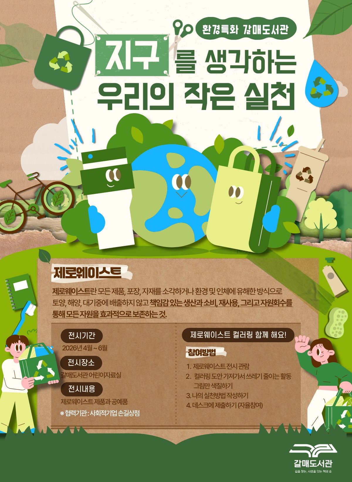 [PEDIEN] 구리시 갈매도서관은 2026년 연중 기획 환경 특화 전시 프로그램 ‘사계절 갤러리’의 일환으로 2분기 전시 ‘지구를 생각하는 우리의 작은 실천 – 제로웨이스트’를 4월 1일부터 운영한다고 밝혔다.