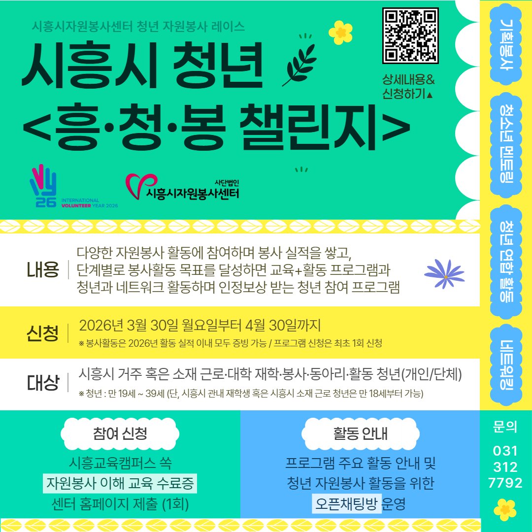 이번 챌린지는 봉사활동과 다양한 혜택을 결합한 새로운 형태의 참여형 자원봉사 모델이다. 시흥시 청년은 물론 관내에서 활동하는 청년이라면 누구나 참여 가능하다.