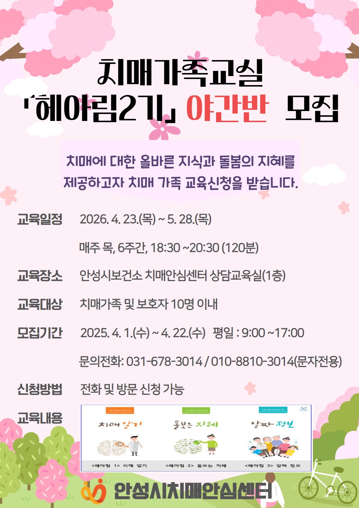 센터는 이번 야간반 운영을 통해 더 많은 가족에게 교육 기회를 제공하고, 치매 환자와 가족 모두가 희망과 용기를 얻을 수 있도록 지원할 계획이다. 전화 및 방문을 통해 신청할 수 있다.