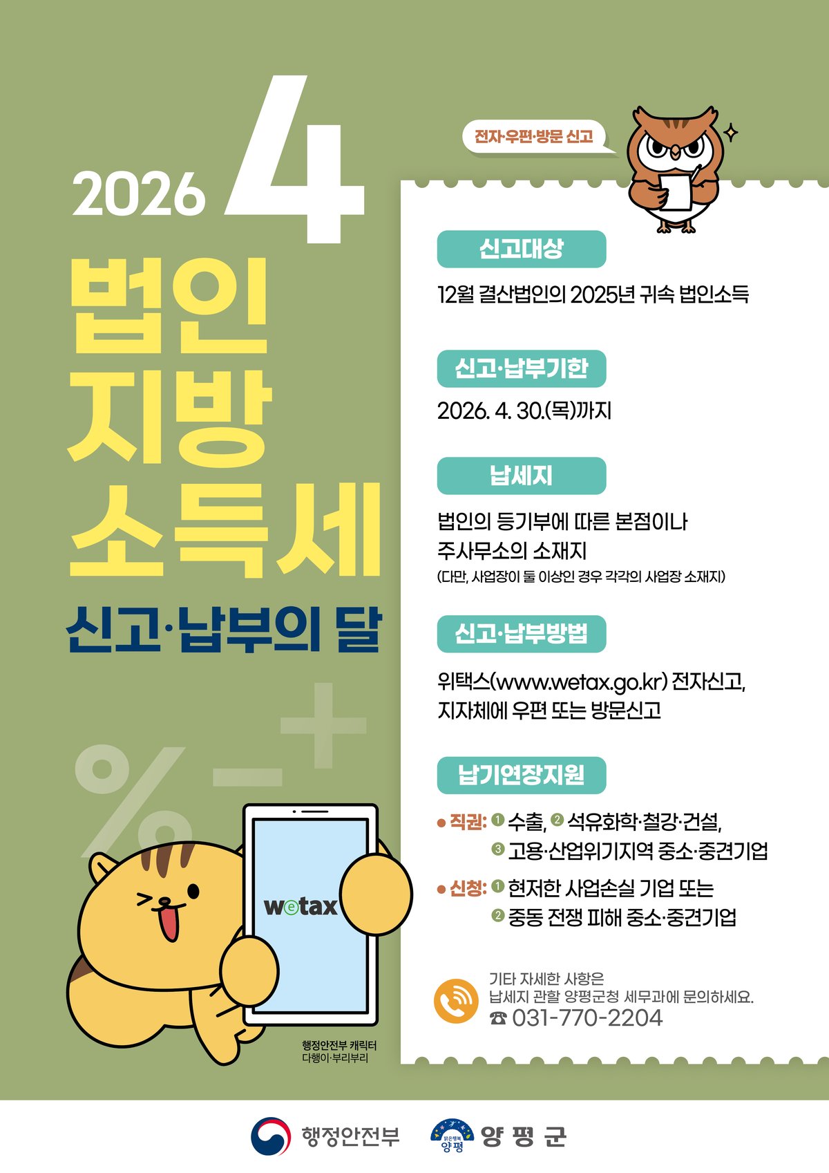 [PEDIEN] 양평군이 4월 한 달간 법인지방소득세 확정신고 납부 기간을 운영한다.