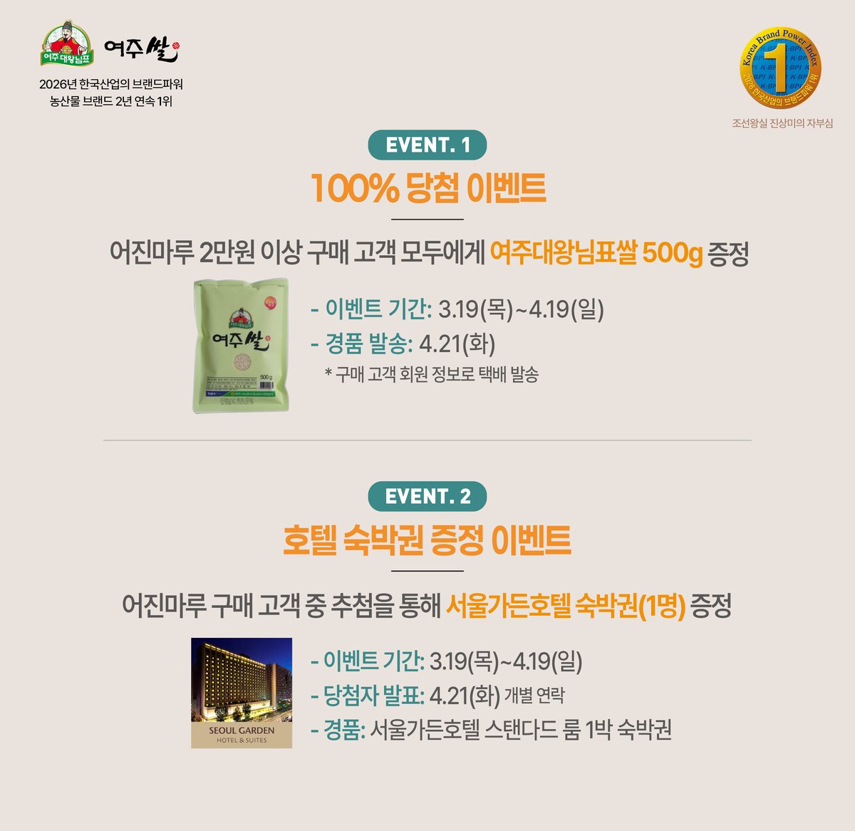 이를 기념하여 4월 19일까지 어진마루몰에서 특별 이벤트를 진행한다. 2만원 이상 구매하는 모든 고객에게 여주쌀 500g을 추가로 증정한다.