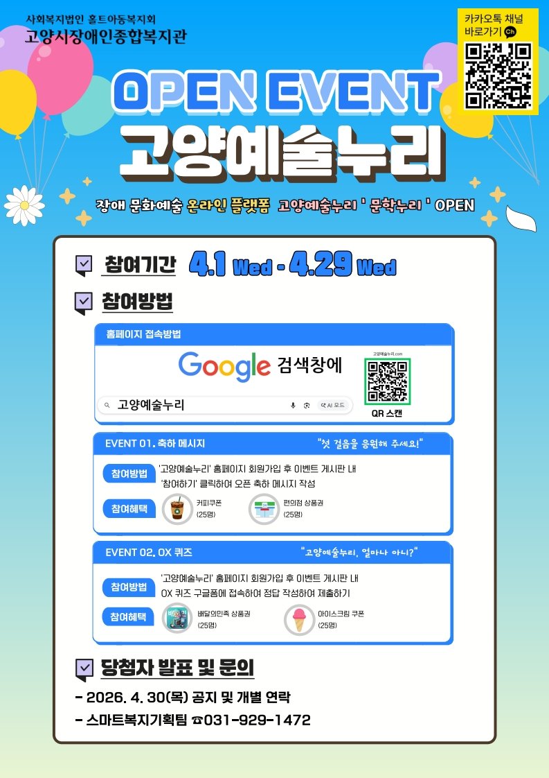 고양시장애인종합복지관은 플랫폼 이용자를 늘리고 전시를 활성화시키기 위해 4월 1일부터 29일까지 다양한 이벤트를 실시하고 이벤트 참여자 중 추첨을 통해 다양한 기프티콘을 제공할 예정이다.