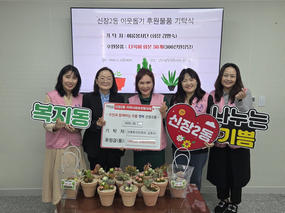 이은영 신장2동장은 “문화티켓 기탁에 이어 따뜻한 나눔을 이어가고 있는 이룸봉사단에 깊이 감사드린다”며 “기탁받은 다육이 화분은 기부자의 정성을 담아 각 가정에 소중히 전달하겠고 앞으로도 주민들이 체감할 수 있는 복지서비스 제공에 최선을 다하겠다”고 밝혔다.