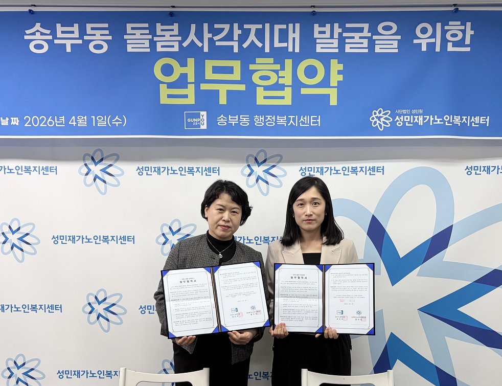 [PEDIEN] 군포시 송부동이 지난 4월 1일, 지역 내 돌봄 사각지대 해소를 위해 성민재가노인복지센터와 손을 잡았다. 양 기관은 민관 협력 업무협약을 체결하고, 위기가구 발굴 및 지원을 위한 협력체계를 구축하기로 했다.