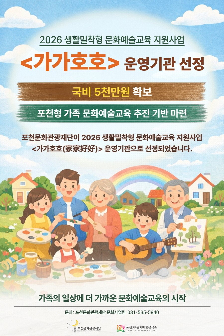 [PEDIEN] 포천문화관광재단이 2026 생활밀착형 문화예술교육 지원사업인 '가가호호' 운영기관으로 최종 선정됐다.