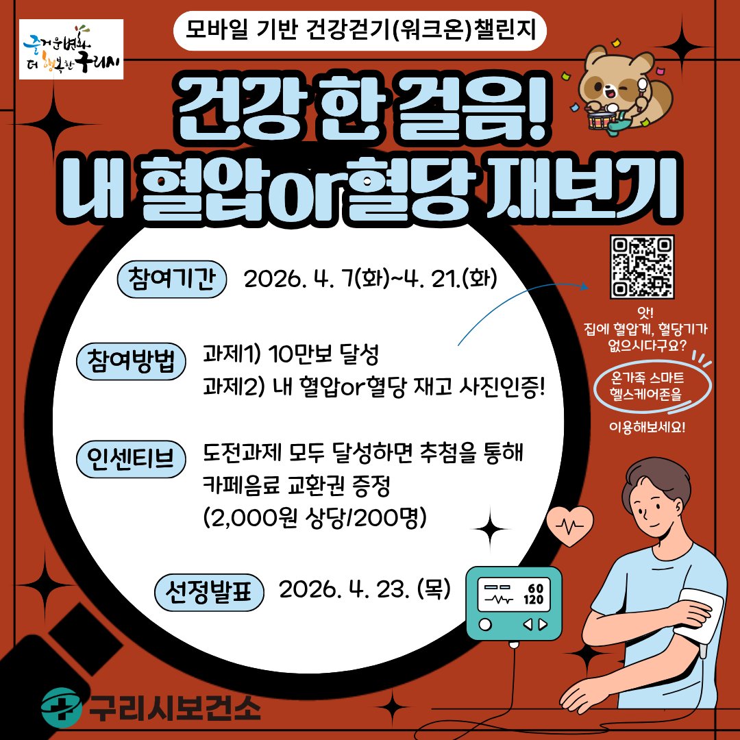 [PEDIEN] 구리시가 시민들의 건강한 생활 습관을 장려하기 위해 '건강한 걸음 내 혈압 혈당 재보기' 챌린지를 4월 7일부터 21일까지 15일간 운영한다.