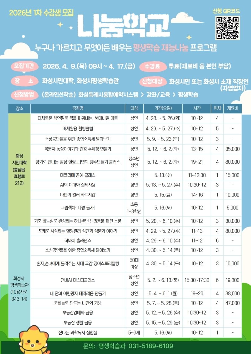 [PEDIEN] 화성특례시는 시민 간 지식과 재능을 나누는 평생학습 프로그램 ‘나눔학교’의 2026년 1차 수강생을 오는 4월 9일부터 4월 17일까지 선착순으로 모집한다.