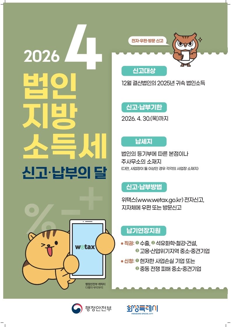 화성시 관계자는 "법인지방소득세 신고 기간을 맞아, 대상 법인들이 불이익을 받지 않도록 적극적으로 안내할 계획"이라고 말했다.