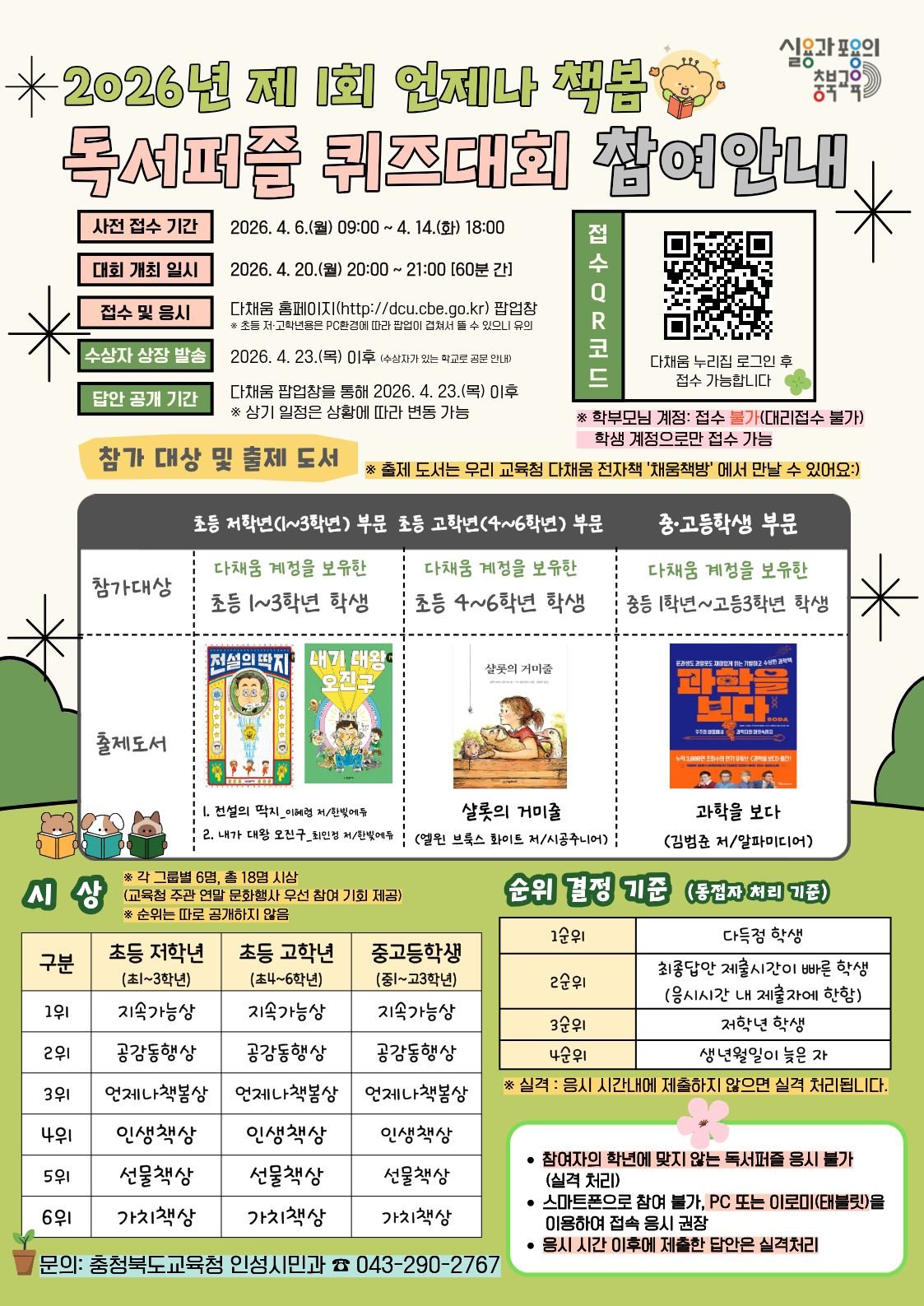 [PEDIEN] 충청북도교육청이 학생들의 독서에 대한 흥미를 높이고, 자기주도적인 독서문화를 확산하기 위해 '2026년 제1회 언제나 책봄 독서퍼즐 퀴즈대회'를 20일에 개최한다고 밝혔다.