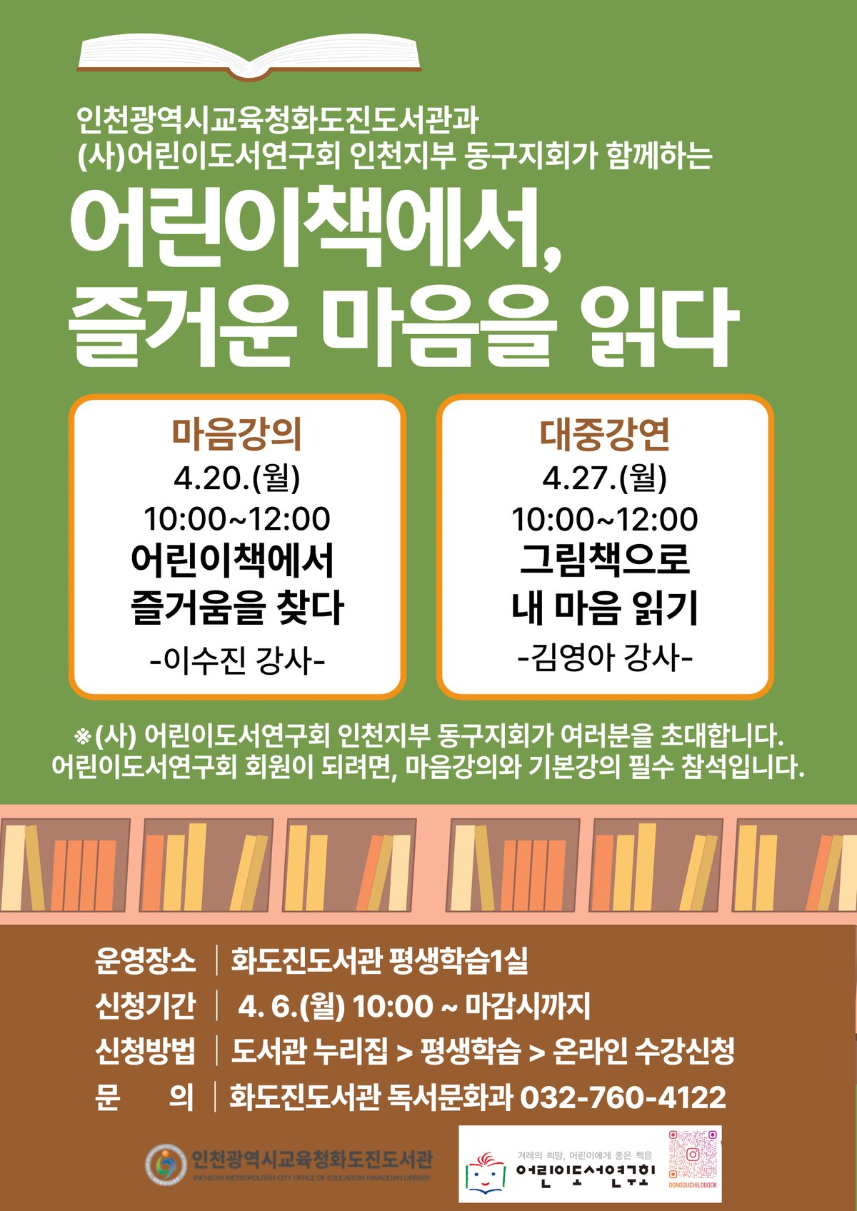 프로그램은 총 2회 과정으로 구성되며 4월 20일 ‘어린이책에서 즐거움을 찾다’ 와 27일 ‘그림책으로 내 마음 읽기’를 주제로 강연이 진행된다.