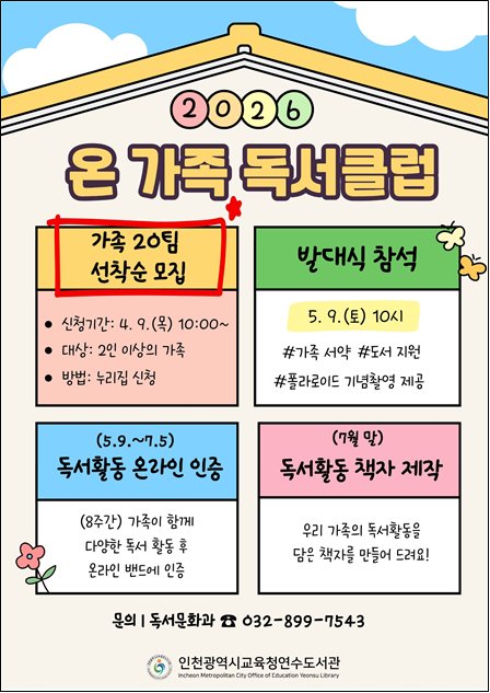 [PEDIEN] 인천광역시교육청연수도서관이 가족 간의 따뜻한 소통과 함께하는 성장을 지원하는 '온 가족 독서클럽'을 5월 9일부터 운영한다.