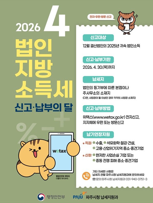 [PEDIEN] 파주시는 4월 한 달을 법인지방소득세 집중 신고 기간으로 정하고, 신고 지원에 나선다.