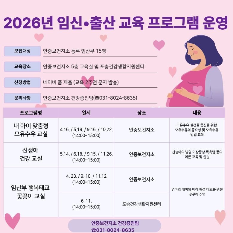 [PEDIEN] 평택시 안중보건지소는 관내 임산부들의 건강한 출산을 돕고 체계적인 육아 정보를 제공하기 위해 ‘2026년 임신 출산 교육 프로그램’을 본격 운영한다고 밝혔다.