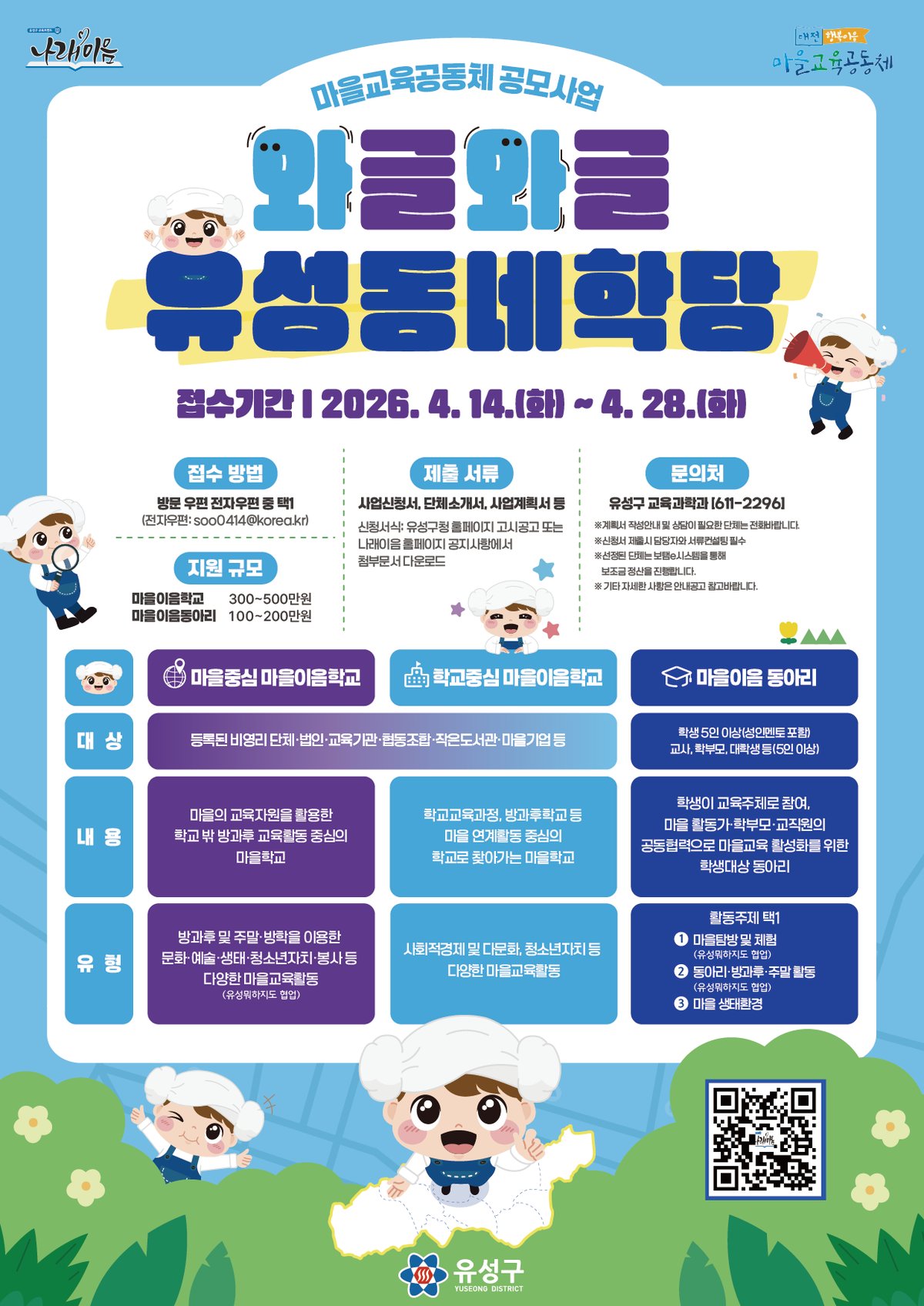 [PEDIEN] 대전 유성구가 학교와 마을을 잇는 '와글와글 유성동네학당' 공모사업을 추진한다. 청소년들에게 다양한 배움의 기회를 제공하고, 마을을 교육 공간으로 확장하기 위함이다.