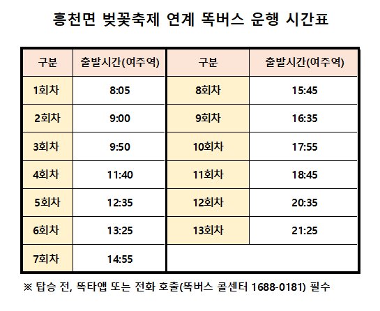 이충우 여주시장은 "흥천 남한강 벚꽃축제는 매년 수많은 인파가 몰리는 여주의 대표 축제인 만큼, 방문객들이 교통 불편 없이 축제를 즐길 수 있도록 특별 운행을 마련했다"며 "특히 여주역에서 바로 연결되는 똑버스를 편리하게 이용해 즐거운 봄나들이 즐기시길 바란다"고 전했다.