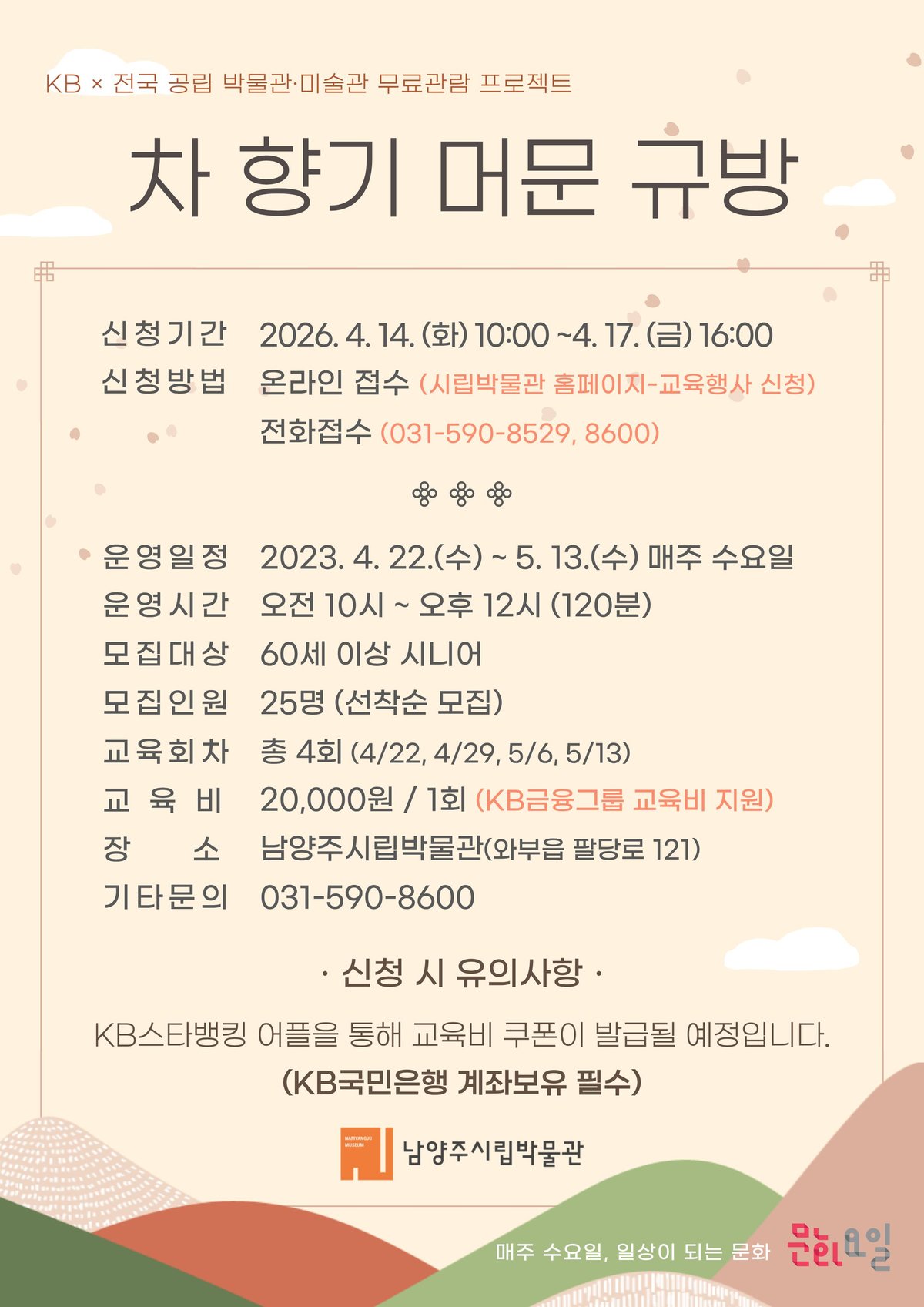 이번 프로그램은 KB금융그룹과 한국박물관협회가 함께 추진하는 '전국 공립 박물관 미술관 무료관람 프로젝트' 공모사업에 선정되어 참가비는 전액 무료다. 시 관계자는 “이번 프로그램이 전통문화를 체험하고 일상에서 활용하는 좋은 기회가 되길 바란다”고 전했다. 덧붙여 “시민들의 삶과 더욱 밀접하게 연결된 문화 프로그램을 지속적으로 확대해 나갈 계획”이라고 밝혔다.