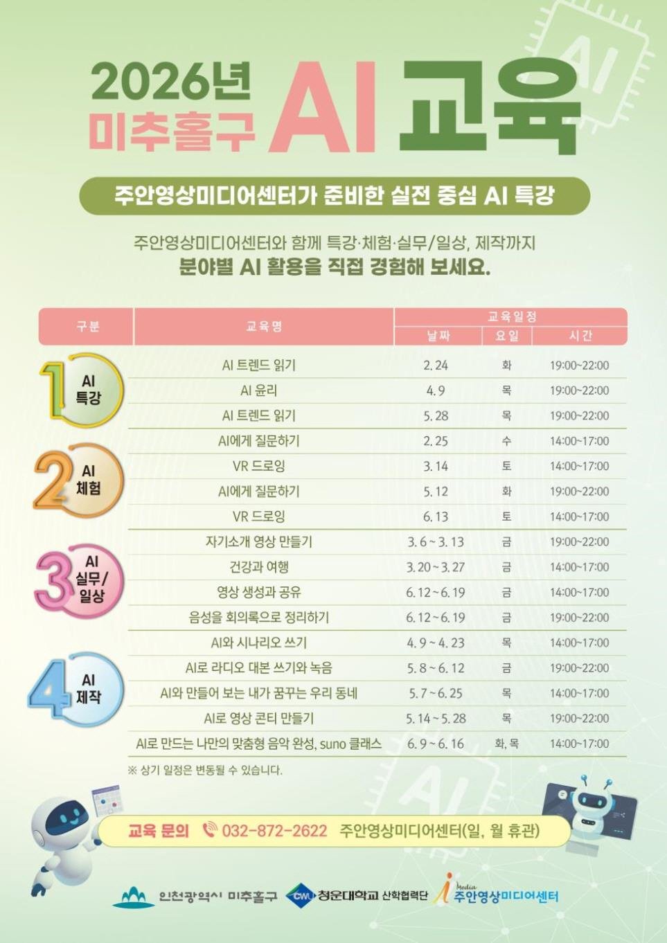 [PEDIEN] 인천 미추홀구 주안영상미디어센터가 지역 주민의 디지털 역량 강화를 위해 발 벗고 나섰다. 2026년 상반기, 실전 중심의 인공지능 교육 프로그램을 본격 운영한다는 계획이다.