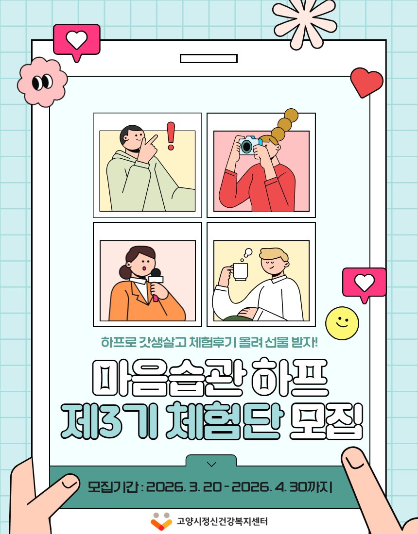 [PEDIEN] 고양시정신건강복지센터가 오는 30일까지 '마음습관 하프' 체험단 3기를 모집한다.