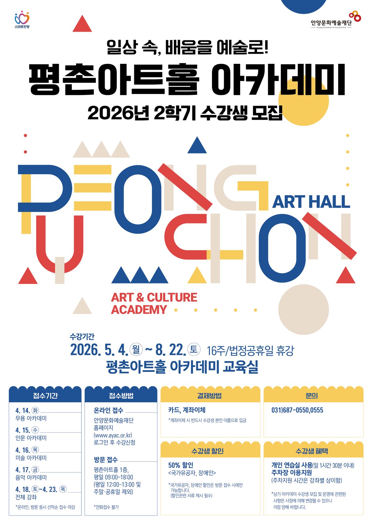 [PEDIEN] 안양문화예술재단이 운영하는 평촌아트홀 아카데미가 2026년 2학기 수강생을 모집한다. 시민들이 일상 속에서 예술을 즐기고 배우는 기회를 제공하기 위해서다.