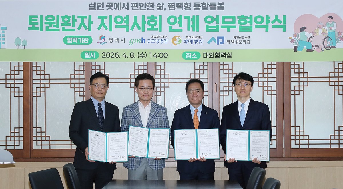 평택시는 지난 8일 시청 대외협력실에서 굿모닝병원, 박애병원, 평택성모병원과 '퇴원환자 지역사회 연계사업' 업무 협약을 체결했다고 밝혔다. 이번 협약은 퇴원 후 의료 및 돌봄 지원이 필요한 시민들이 지역사회에서 안정적인 생활을 이어갈 수 있도록 지원하는 데 목적이 있다.