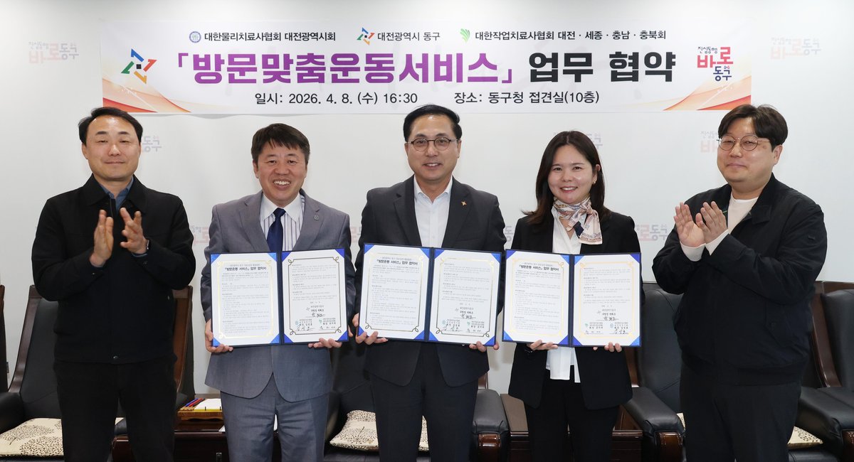 동구는 대한물리치료사협회 대전시회, 대한작업치료사협회 대전세종충남충북회와 손잡고 '방문 운동 서비스' 지원을 위한 업무 협약을 체결했다고 9일 밝혔다. 이번 협약은 거동이 불편한 주민들의 재활과 일상 복귀를 돕는 데 초점을 맞췄다.
