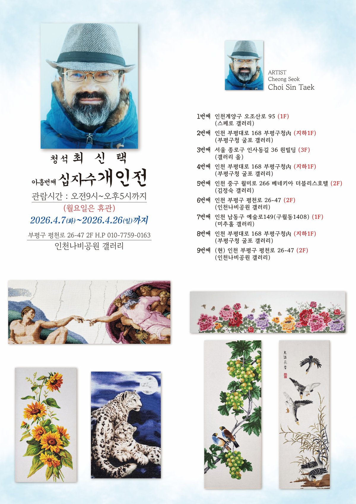 최신택 작가는 그간 굴포갤러리 등 지역에서 꾸준히 작품 활동을 이어왔다. 이번 전시에서는 자연 경관과 풍경, 사랑 등 다양한 소재를 십자수 기법으로 표현한 작품들을 선보인다.