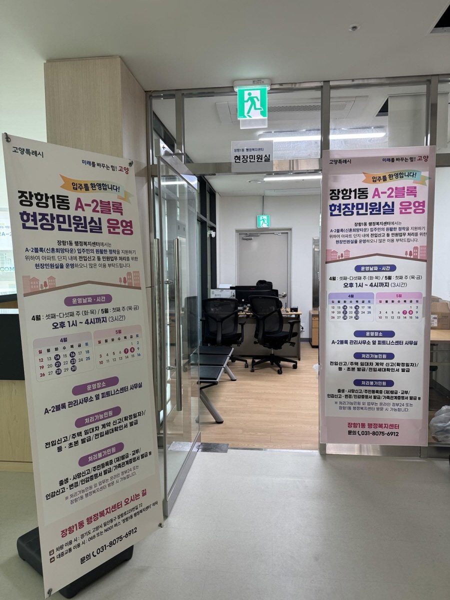 [PEDIEN] 고양특례시 장항1동이 고양장항 공공주택지구 A-2블록에 위치한 아파트 단지 내에 '현장민원실'을 14일부터 운영한다.
