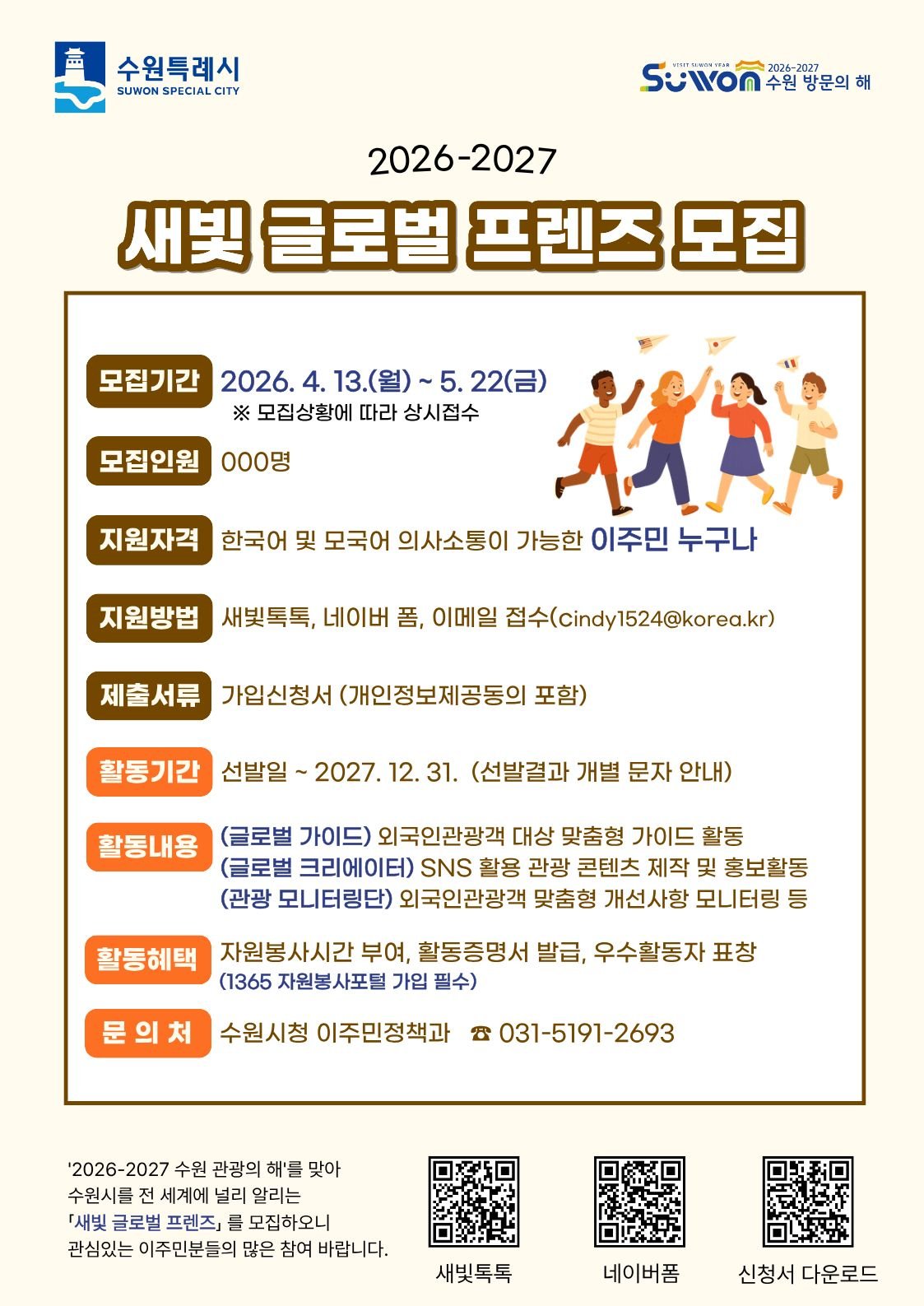 [PEDIEN] 수원시가 '2026~2027 수원 방문의 해'를 맞아 수원의 매력을 전 세계에 알릴 '새빛 글로벌 프렌즈'를 5월 22일까지 모집한다.