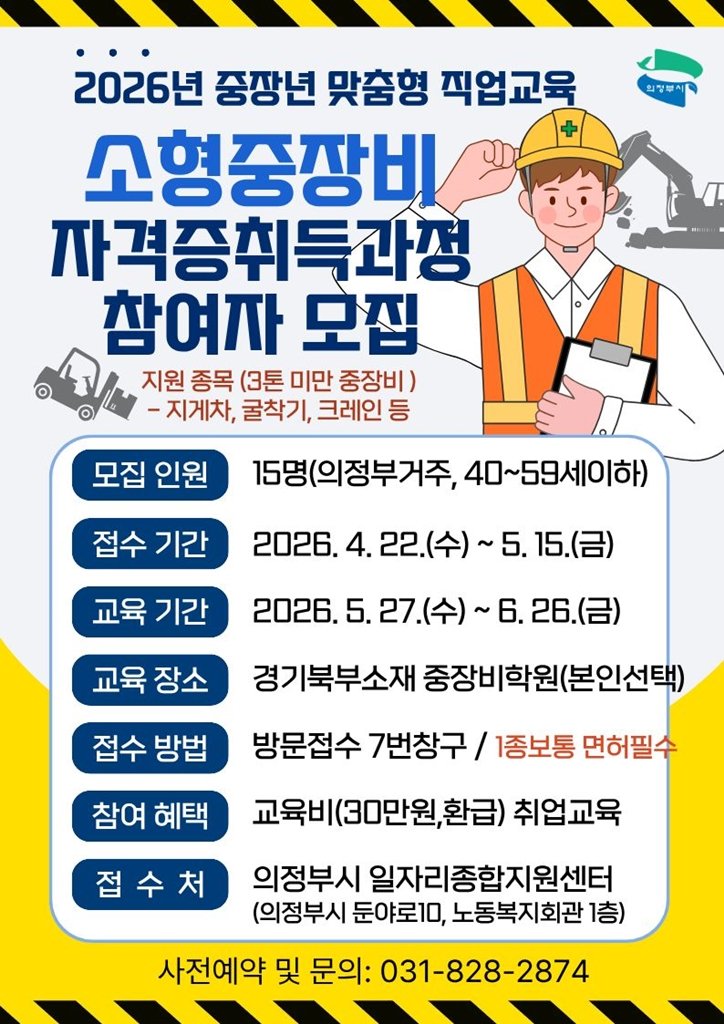 [PEDIEN] 의정부시가 중장년층 구직자들의 재취업을 돕기 위해 ‘소형중장비 자격증 취득 과정’ 참여자를 모집한다.