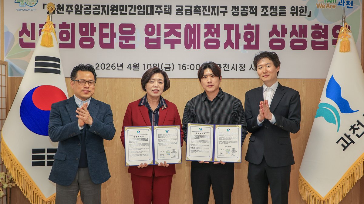 시는 지난 10일, 시청 집무실에서 ‘과천주암 C2블록 신혼희망타운 입주예정자회’와 ‘과천주암지구 기반시설 확충 및 정주여건 개선을 위한 민관 상생협약’을 체결했다.