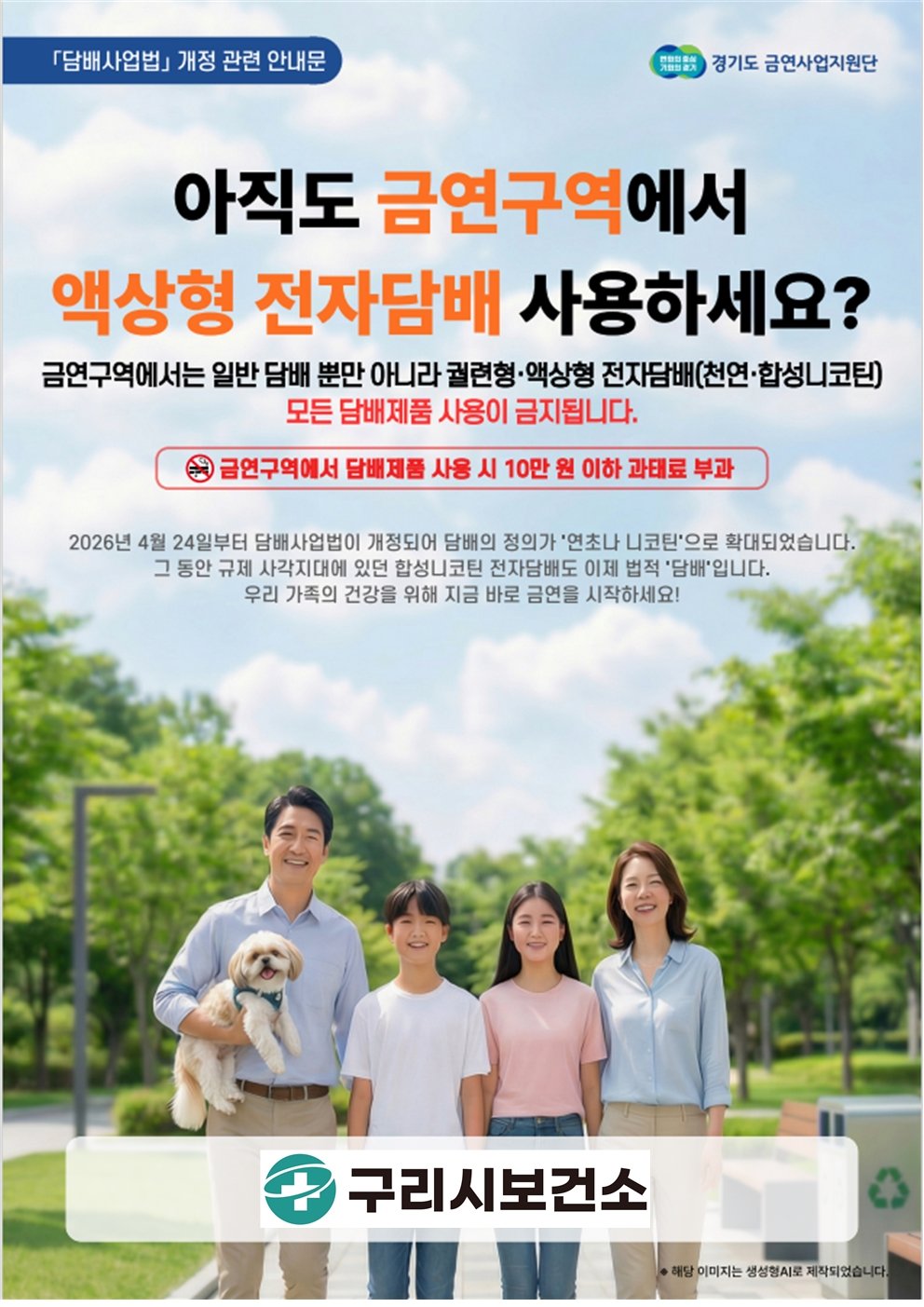구리시는 지역 주민으로 구성된 금연 지킴이와 합동 점검반을 운영한다. 이들은 액상형 전자담배를 포함한 모든 담배 제품의 금연 구역 내 흡연 행위를 집중적으로 단속할 계획이다.