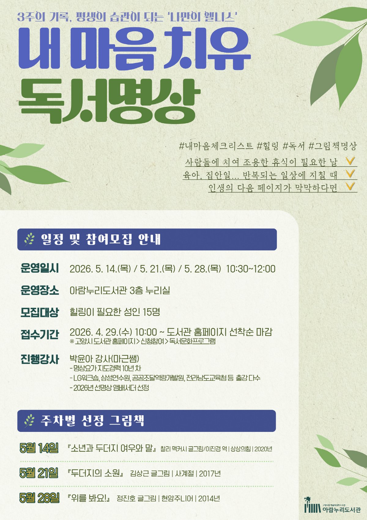 도서관 관계자는 “이번 독서명상 프로그램을 통해 시민들이 잠시나마 긴장을 풀고 자신을 돌아보는 시간을 갖기를 바란다”고 밝혔다. 자세한 내용은 아람누리도서관에 문의하거나 도서관센터 홈페이지를 참고하면 된다.