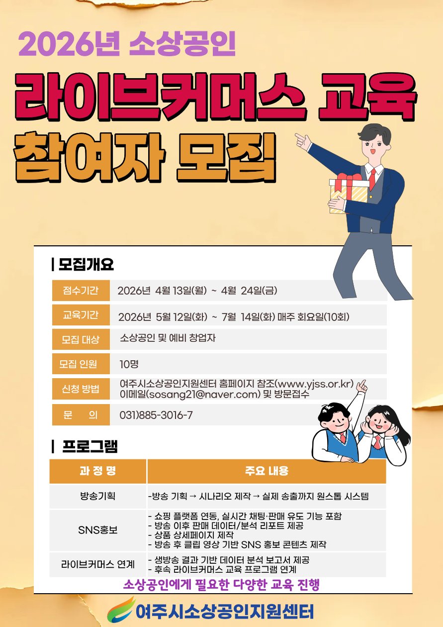 여주시소상공인지원센터는 관내 소상공인과 예비창업자를 대상으로 온라인 판로 확대와 매출 증대를 위한 ‘라이브커머스 참여업체’를 4월 24일까지 모집한다고 밝혔다.