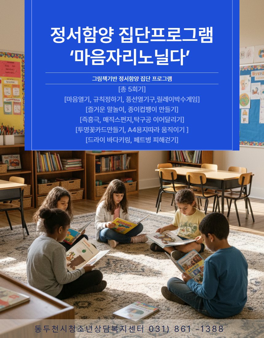 동두천시청소년상담복지센터는 2026년 4월부터 11월까지 지역 내 초등학교와 손잡고 '마음자리 노닐다' 프로그램을 진행한다고 밝혔다. 이 프로그램은 아동들의 정서 함양을 목표로 한다.