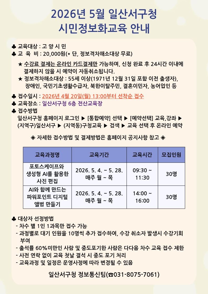 [PEDIEN] 고양특례시 일산서구가 시민 디지털 역량 강화를 위해 5월 시민정보화교육을 운영한다.