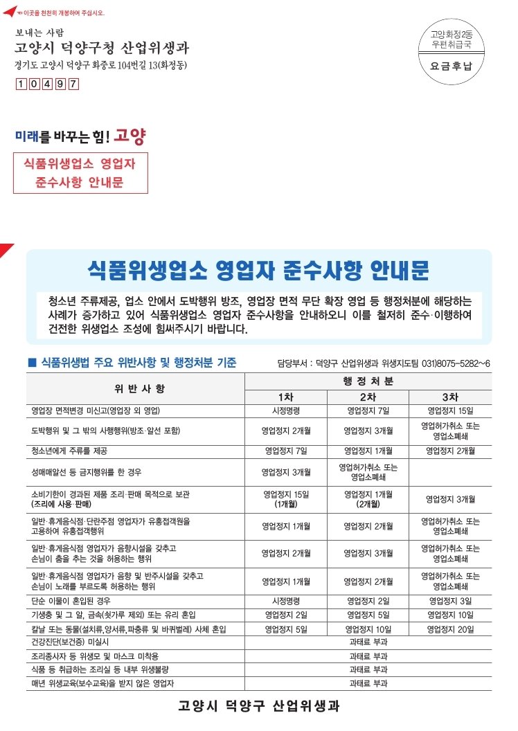 [PEDIEN] 고양시 덕양구가 관내 식품위생업소 5784개소를 대상으로 영업자 준수사항 안내문을 배포한다.