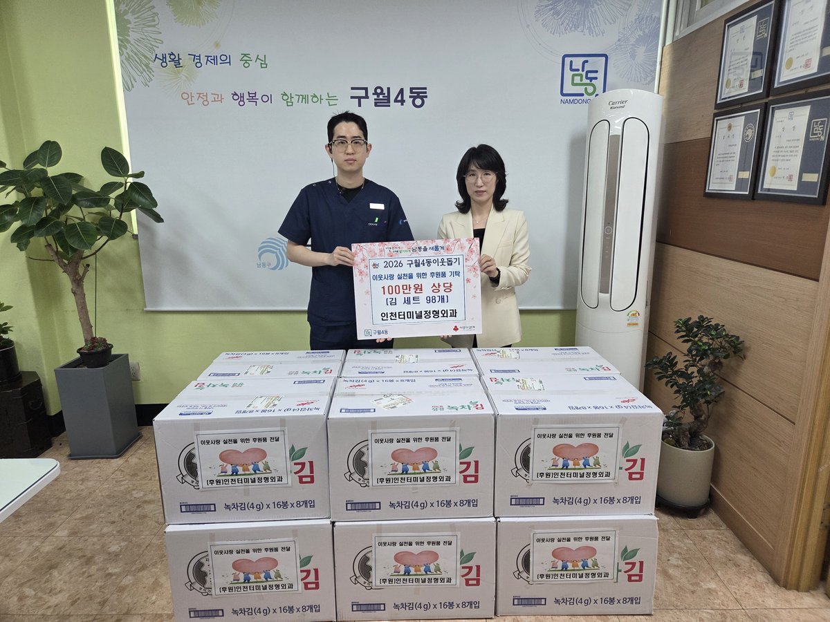 인천터미널정형외과가 최근 100만원 상당의 도시락 김을 구월4동 행정복지센터에 후원하며 지역 사회에 훈훈함을 더했다. 이번 후원 물품은 고령 1인 가구 등 복지 취약계층에게 전달될 예정이다.
